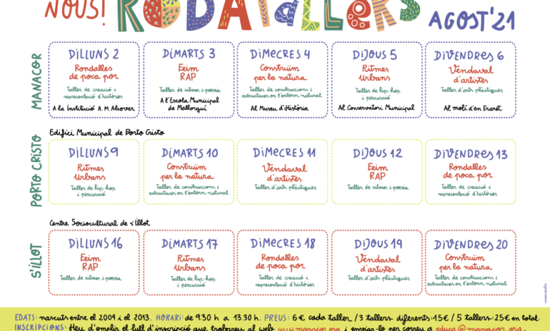 L’oferta educativa i de lleure de l’Ajuntament de Manacor continua el mes d’agost a Manacor, Porto Cristo i s’Illot amb els Rodatallers adreçats als infants nascuts entre el 2009 i el 2013. Es tracta d’una oferta de tallers especialitzats de dilluns a divendres en horari de 9.30 h a 13.30 h. Cada infant pot seleccionar un màxim de cinc tallers per mes, ja que l’objectiu de l’Ajuntament de Manacor és el d’arribar al màxim de públic possible. «Es tracta d’una oferta complementària al que ja ofereixen les escoles d’estiu perquè els infants puguin gaudir d’aquest lleure uns dies a la setmana», assegura el delegat d’Educació, Mateu Marcé.