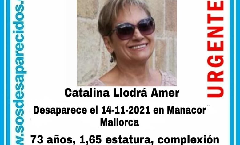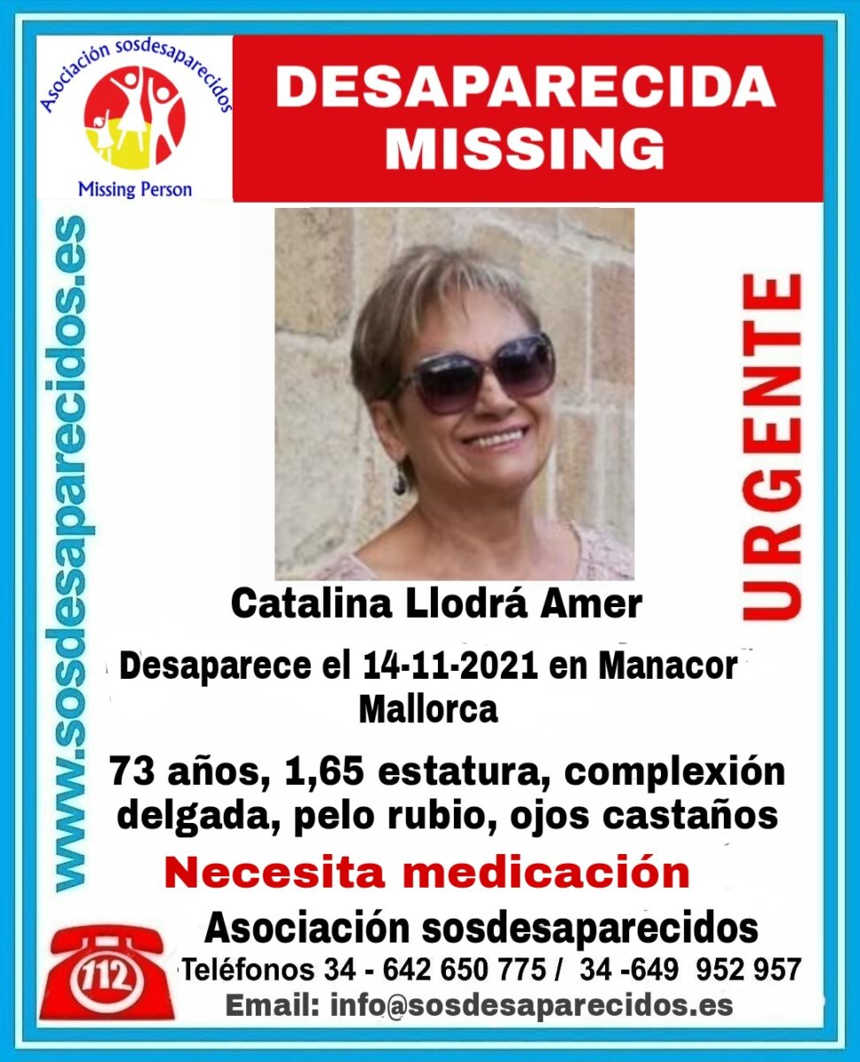 La asociación SOS Desaparecidos sigue buscando a Catalina Llodrà Amer, mujer de 73 años que se mantiene en paradero desconocido desde el 14 de noviembre de 2021 en Manacor. Tras más de siete meses desaparecida, la asociación vuelve a ponerse en marcha pidiendo colaboración ciudadana en la búsqueda de esta mujer de avanzada edad, detallando que mide 1’65 metros de estatura, es de complexión delgada, pelo rubio y ojos castaños. A través de las redes sociales la asociación ha vuelto a iniciar la campaña propagandística con el fin de topar con el paradero de la mujer, la cual requiere de medicación diaria.