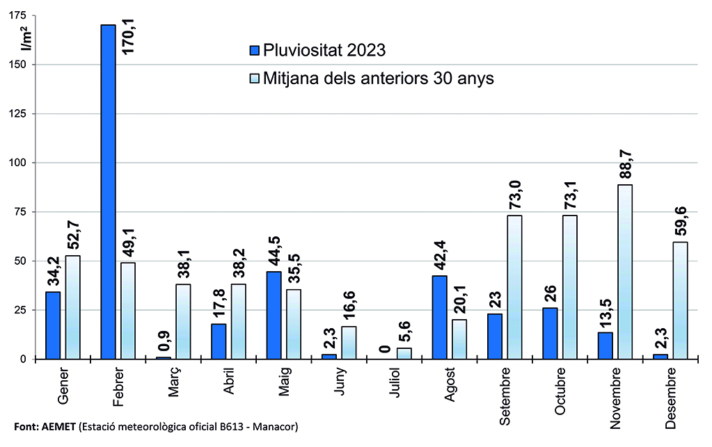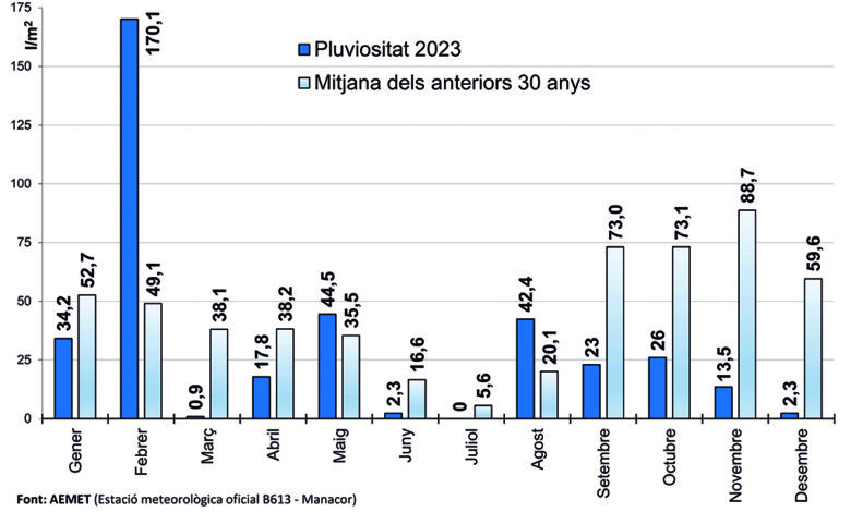 I és que feia 23 anys que no plovia tan poc a Manacor, només 377 litres per metre quadrat en tot el 2023. Gairebé un 32% per davall de la mitjana dels darrers 30 anys. Dels dotze mesos de l’any, només en 3 ha plogut per damunt de la mitjana: febrer, maig i agost. Per afegit, les pluges no han aconseguit fer penetrar suficientment la humitat a la terra, només 10 episodis de pluges en tot l’any han aconseguit arribar als 20 centímetres dins la terra.