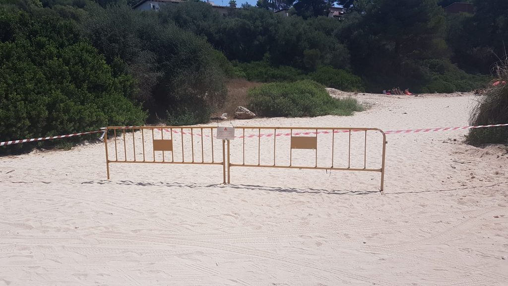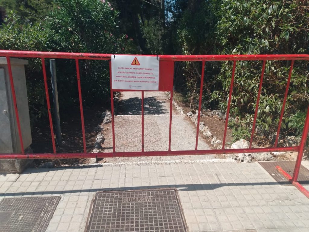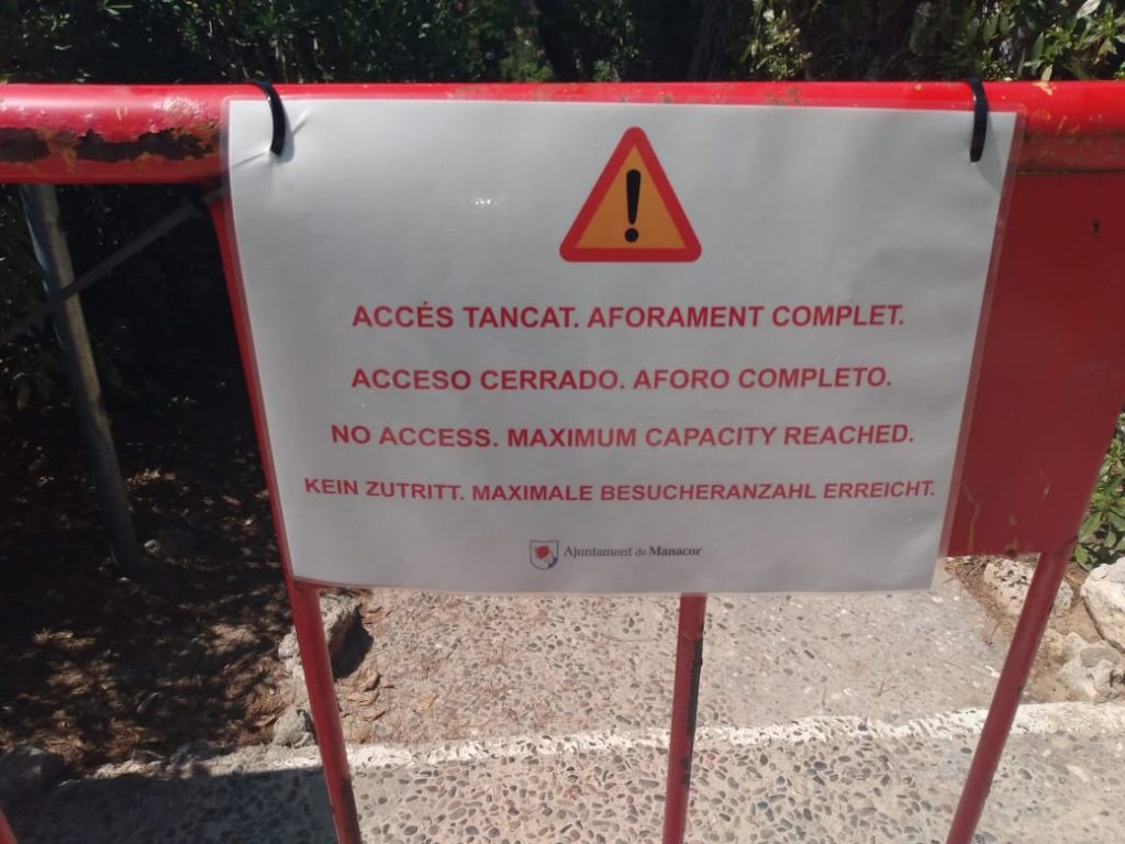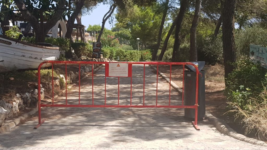 Este jueves al mediodía, el Ajuntament de Manacor ha procedido al cierre de la playa de Cala Anguila, con barreras y letreros, ya que se encontraba con aforo completo para un correcto distanciamiento entre bañistas.