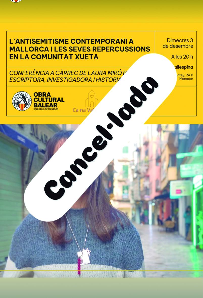 L’Obra Cultural Balear de Manacor va convidar Na Laura Miró Bonnín, una entesa en història, a fer una conferència dimecres de la setmana passada, a ca Na Vallespina, sobre «L’antisemitisme contemporani a Mallorca i les seves repercussions en la comunitat xueta». Aviat n’hi va haver, tant de dins l’Obra com de defora, que se posaren molt mal a pler. Pegaren el crit al cel. Arribaren a punyir la central general de Palma de l’Obra perquè aturàs la xerrada. Qualque soci fins i tot va fer amenaces de donar-se’n de baixa. La direcció de Palma no va donar ordres de censurar la conferència, però sí que va demanar a la delegació de Manacor que pensàs si convenia fer-la o no, davant l’escandalera que tants n’hi havia que feien.