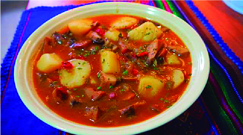 -Afegirem el vi blanc i després d’evaporar-se l’esperit, hi abocarem l’aigua (millor brou de carn) fins que quasi cobreixi tot el guisat.