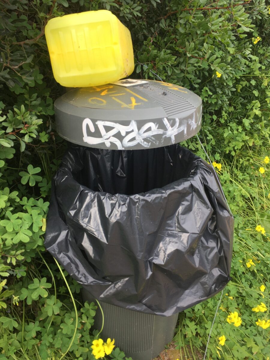 – En Cala Domingos (al lado del hotel América, en una calle peatonal, justo bajando hacia la cala), una papelera completamente destrozada.