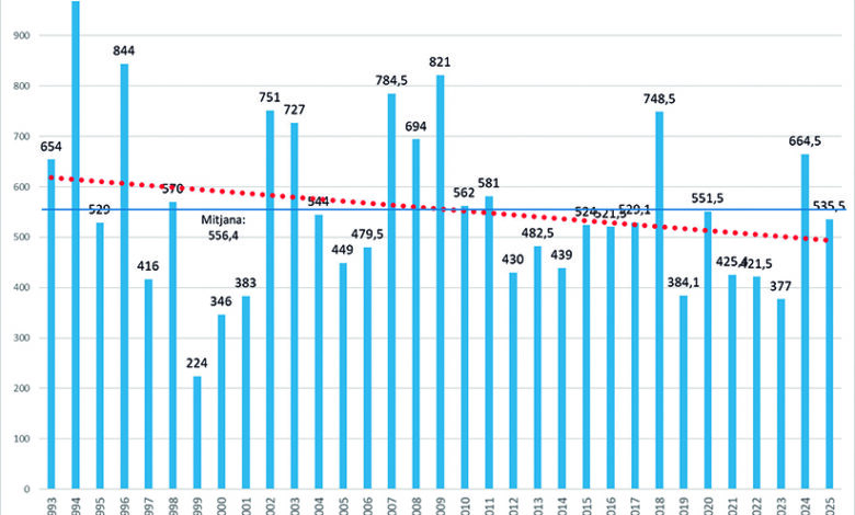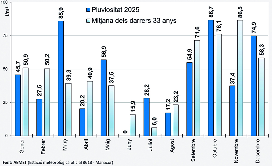 Idò la veritat és que el 2025 ha estat un any de pluviositat propera a la mitjana dels darrers 30 anys, registrant-se a l’observatori B613 de s’Ermita 535,5 litres per metre quadrat, sempre una mica menys que dins el nucli urbà de Manacor, encara que hi hagi menys de dos quilòmetres de distància. Les precipitacions de 2025 han estat més importants en els mesos de març, octubre i desembre, contràriament a l’habitual, que se solen concentrar en els mesos de setembre, octubre i novembre.