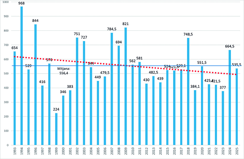 Si analitzam les dades recollides en els darrers trenta anys, que ja és una quantitat significativa i permet que les estadístiques siguin fiables, veim que la línia de tendència que es calcula matemàticament és lleugerament decreixent. És a dir, la pluviositat disminueix. Aquesta és una dada que no admet discussió, i que demostra la realitat del canvi climàtic, negat per alguns.