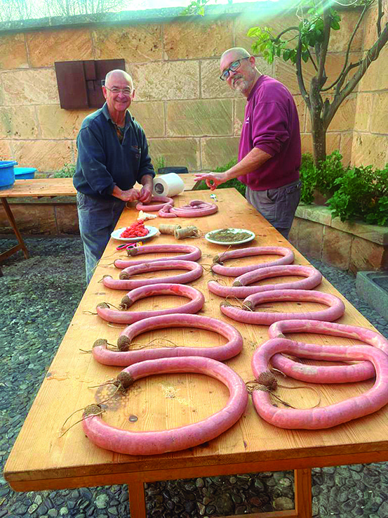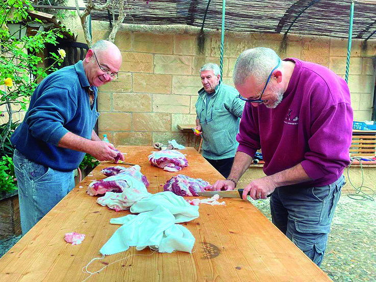 A les 11’00 h, els assistents varen berenar de frit de matances i frit de sang, i a les 19’00 h varen sopar d’un arròs brut i aguiat de pilotes cuinat pel President, Miquel Gelabert.