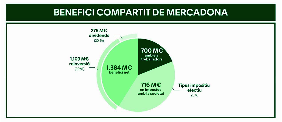 El 2024, Mercadona ha obtingut la seva millor dada històrica de rendibilitat: un 3,9% de benefici net sobre venda neta, resultat d’una inversió sostinguda en el temps, 1.045 milions en aquests dotze mesos, que està reportant grans millores de gestió, productivitat i eficiència. Com a resultat, s’ha elevat el seu benefici compartit a 2.800 milions d’euros, que s’han repartit, entre altres, de la manera següent: 700 milions amb la plantilla i 716 milions en impostos, dels quals 506 corresponen a l’impost sobre beneficis, amb un tipus impositiu efectiu del 25%.