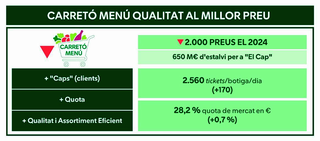 Aquest increment de facturació ha estat possible pel treball dut a terme per Compres i Prescripció, conjuntament amb els interproveïdors i proveïdors especialistes. Gràcies a aquesta col·laboració, i després de fer 2.000 baixades de preu que han suposat un estalvi de 650 M€ per als “Caps” (clients), s’ha continuat oferint el carretó menú amb una qualitat contundent al preu més econòmic del mercat (un 2% menys), així com una experiència de compra amb un assortiment eficient que fa que cada dia més clients triïn a la companyia com la millor opció.