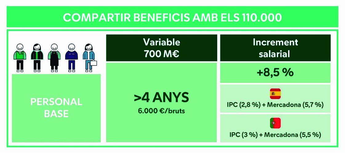 L’any 2024, ha creat més de 6.000 nous llocs de treball estables i de qualitat, 4.300 a Espanya i 1.700 a Portugal, fins a aconseguir la xifra de 103.000 i 7.000 persones respectivament. Per reconèixer l’esforç, el compromís i l’exemple d’un equip d’alt rendiment que mai es posa límits, Mercadona ha incrementat el salari un 8,5%, més de cinc punts per sobre l’IPC d’Espanya i de Portugal, a més de compartir una variable (prima) de 700 milions d’euros per objectius que va lligada als beneficis de la companyia. Això ha suposat que un treballador amb més de quatre anys d’antiguitat hagi rebut, l’1 de març d’aquest any, 6.000 €/bruts que corresponen a tres mensualitats en variable.