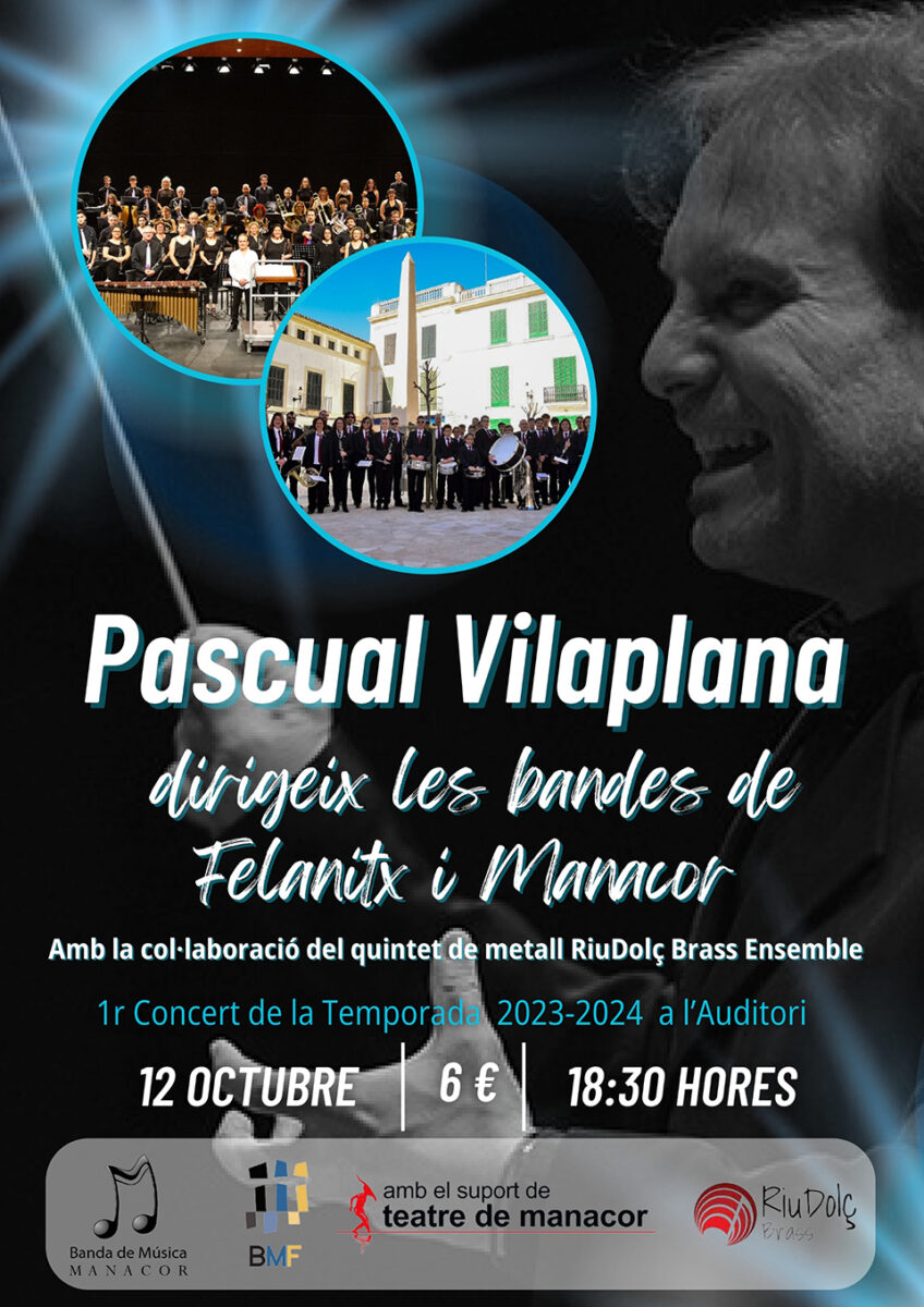 Aquest dijous dia 12 d’octubre, a les 18’30 h, les bandes de música de Felanitx i Manacor s’uneixen per oferir el primer concert de la temporada de la Banda de Música de Manacor a l’Auditori, on actuaran baix la batuta de José Rafael Pascual Vilaplana, actualment considerat un dels millors directors a nivell nacional. Ha rebut un llarg llistat de premis i reconeixements, i és el director titular de la Banda de Bilbao i cotitular de la Banda de Barcelona. A part de la seva trajectòria com a director també és un compositor de reconegut prestigi.