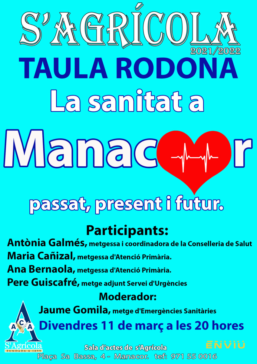 Avui divendres dia 11 de Març a les 20 hores, tendrà lloc a S’Agrícola una interessant taula rodona amb el títol «La sanitat a Manacor: passat, present i futur».