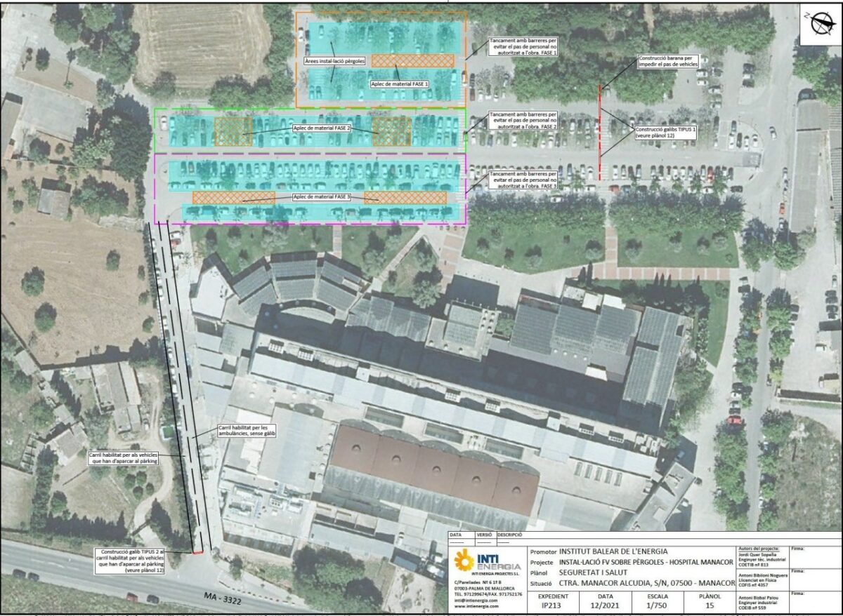 L’Institut Balear de l’Energia va adjudicar la redacció del projecte i la direcció d’obres a INTI Energia, que ha dissenyant una instal.lació que s’implantarà sobre 5.436 m2 de l’aparcament de l’hospital a pèrgoles fotovoltaiques, en compliment de la Llei de canvi climàtic i transició energètica, que estableix que s’han de cobrir amb plaques solars els aparcaments de més de 1.000 m2 per a l’any 2025.
