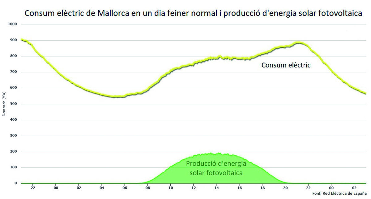 És a dir, que a part de cremar gas, carbó i residus, l’única font d’energia renovable que tenim és la solar, i amb ella aconseguim una quantitat mínima d’energia durant molt poc temps (veure gràfica 1). Gairebé tota l’energia que consumim procedeix de la combustió, i té com a conseqüència enviar tones i tones de CO2 a l’atmosfera. Augmentar la producció d’energia renovable no és senzill, però és necessari. Si ens limitam a xerrar d’energia fotovoltaica intervenen dos factors, la quantitat de metres ocupats amb plaques i l’eficiència d’aquestes. Es pot augmentar molt en metres, començant per tots els edificis públics, però també es poden signar convenis amb propietaris de naus industrials a canvi d’alguna contraprestació. Els particulars poden crear les seves pròpies instal·lacions d’autoconsum, i ajudaria molt en això que existís una normativa favorable, no com l’actual. Per exemple, es podria obligar a totes les companyies elèctriques a adquirir l’energia al mateix preu que la subministren. També s’ha de fomentar l’autoconsum compartit per part de les administracions públiques, on encara queda molt de camí per recórrer. En canvi la instal·lació de camps fotovoltaics substituint terres de cultiu o pastures és objecte de controvèrsia. En qualsevol cas, la solar per ella mateixa no arregla el problema.