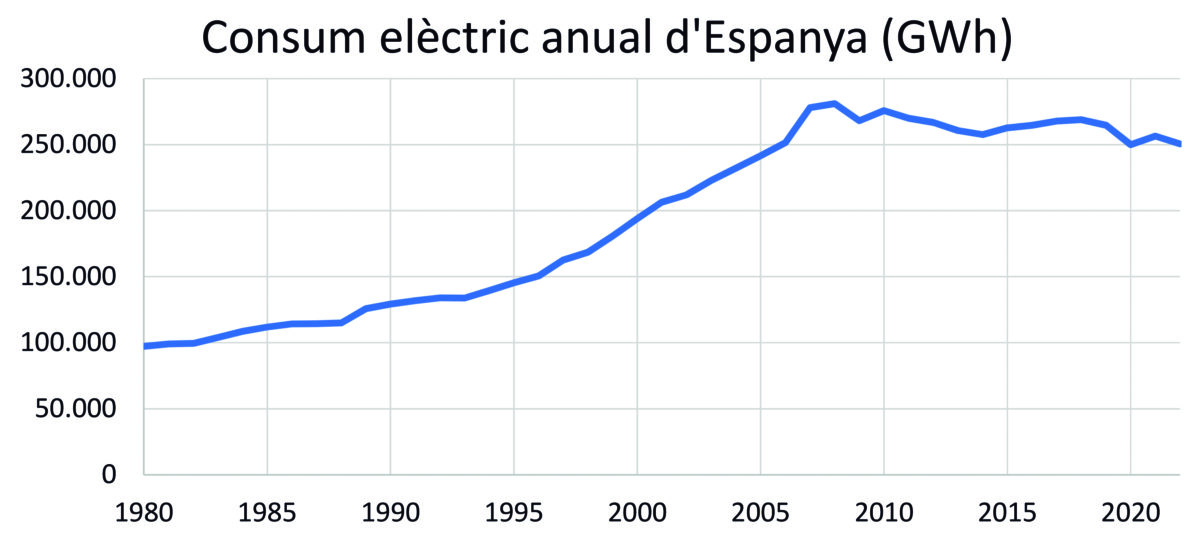 Idò què ens queda? Reduir la quantitat d’energia que consumim? En part ja ho hem fet, perquè els electrodomèstics de cada vegada són més eficients i els llums LED consumeixen de mitjana set vegades menys que les bombetes incandescents. Per això des de 2008 ha anat disminuint progressivament el consum d’energia per càpita a Espanya, quan abans l’augment era constant (veure gràfica 2). Encara que possiblement també hagin ajudat a aquest descens la crisi econòmica de 2007-2010 i després la pandèmia, però no sabem fins a quin punt. Però no es pot caure en el populisme d’afirmar que la disminució del consum elèctric és la solució, perquè no hi ha una sola solució, sinó una combinació d’elles.