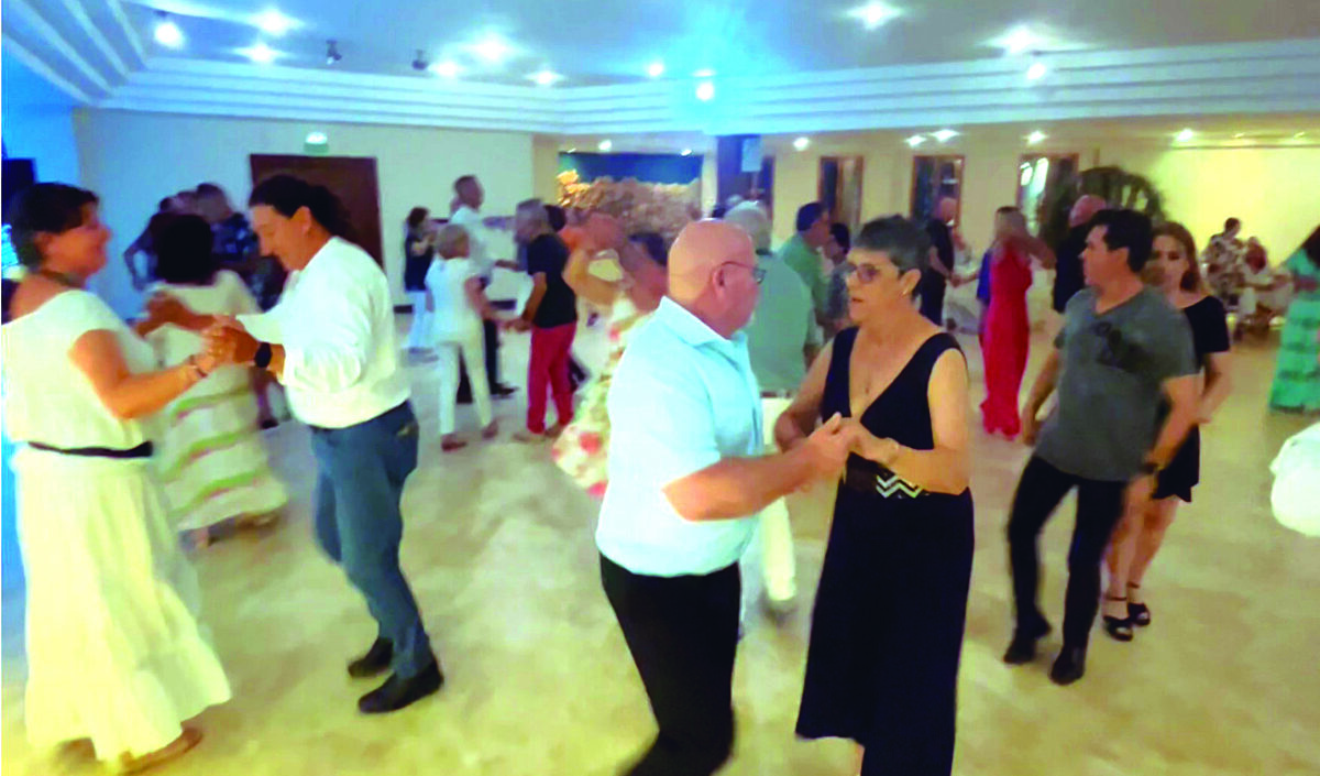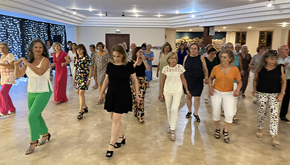 Unos 150 comensales-bailadores se dieron cita en el Salón Tramuntana, en el complejo del Molí d’en Sopa, para disfrutar de una excelente cena: entrantes compuestos de sepia en salsa, gambas al ajillo y chipirones, un plato principal (churrasco o gallo) y gató con helado de postre, acompañado de bebida, café y copa. La cena más la posterior velada de baile, que iba alternando canciones de baile de salón y de línea, por un asequible precio de 25 euros.