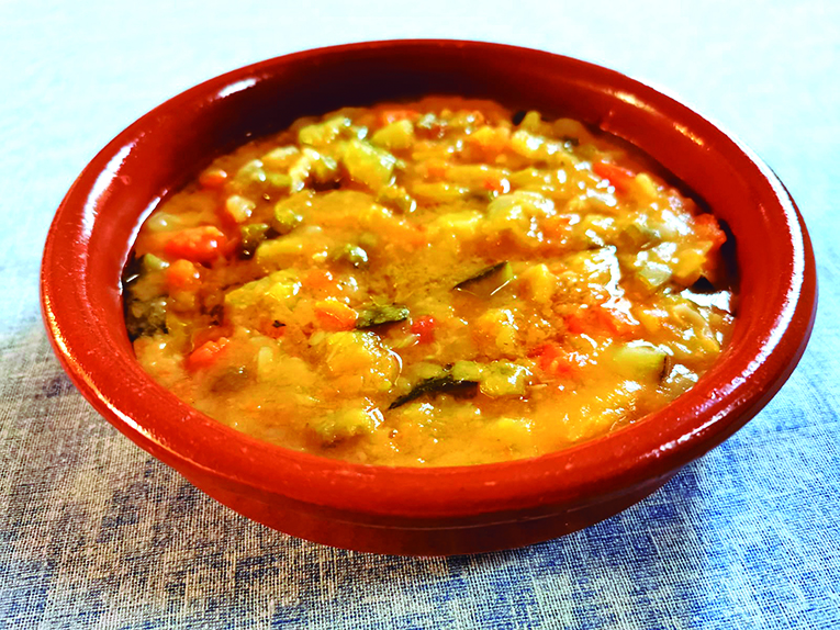 250 g de faves pelades, col, mongetes tendres, carabassa, carabassó, ceba, tomàtiga, pastanagó, patata, alls, llorer, fulles d’alfabeguera, oli, aigua, pebre bord i sal.