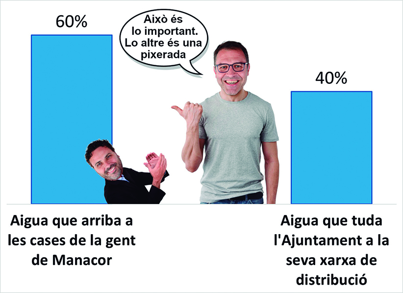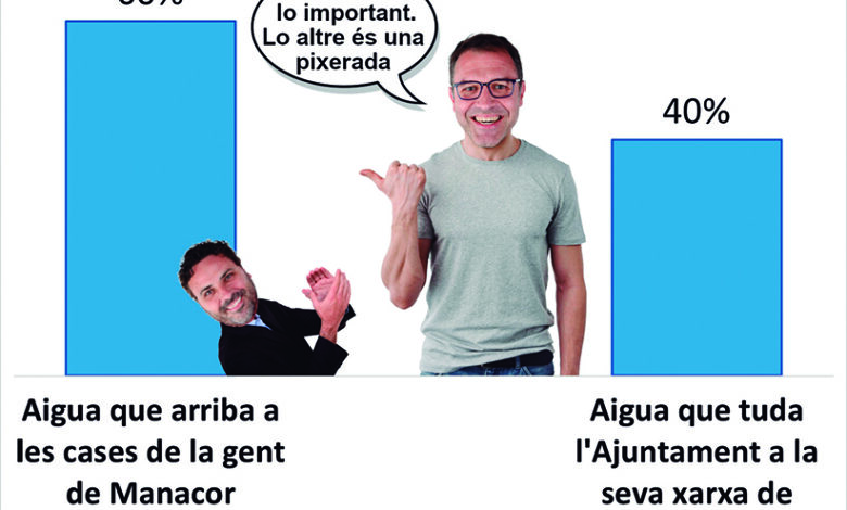 Però, desgraciadament, ara hem de parlar de la realitat. Cap d’aquestes opcions és viable en aquests moments. El motiu és que la xarxa d’aigua de Manacor és un colador. Sí! Un colador que fa que de cada 10 litres que hi circulen se’n perdin 4 per les encletxes, esquerdes, connexions i canonades foradades, i només en puguin arribar 6 fins a les cases. Una autèntica vergonya. I lo més fotut és que governa un partit que s’autoproclama ecologista. Perdó, això no és lo més fotut, lo més fotut és que en els cinc anys i mig que fa que governa no ha tengut orgues de reduir les pèrdues d’aigua.