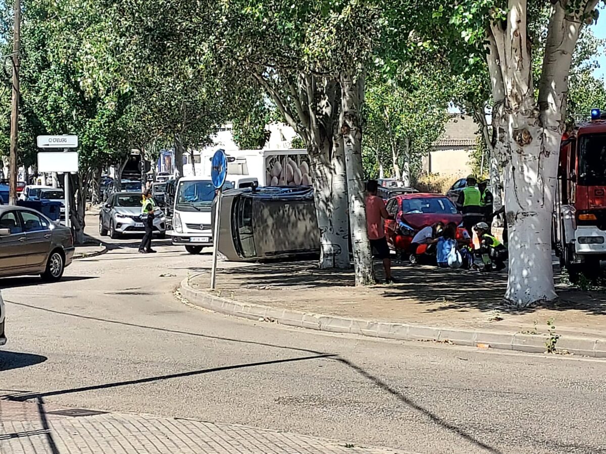 En la mañana de este miércoles 10 de agosto y concretamente en via Palma de Manacor, se producía un accidente entre dos coches, un Hyundai y un Peugeot, en el que este último, a consecuencia del impacto, volcó sobre la via.