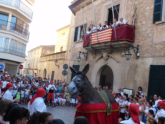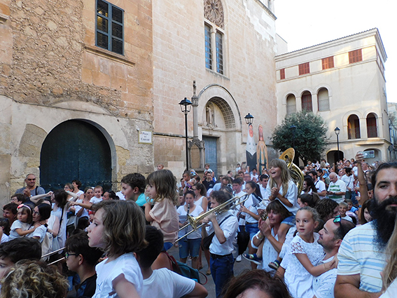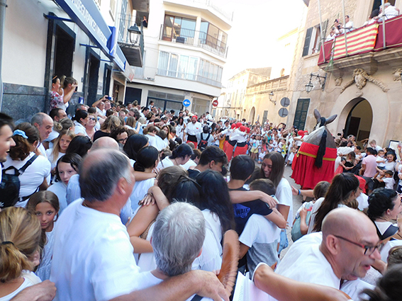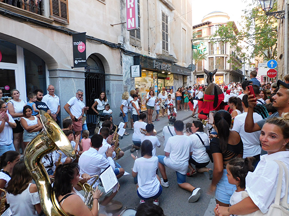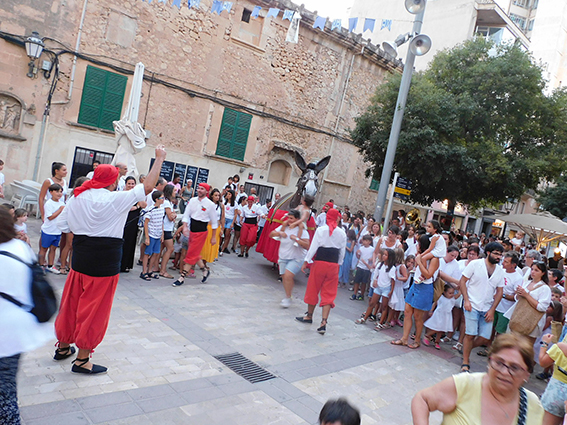 Una vez que la pregonera dio por acabado su discurso, una pequeña traca de fuegos artificiales surcó el cielo de Manacor, para gran deleite de sus ciudadanos, que poco después comenzaron a aplaudir los primeros pasos de sa Mulassa, siempre con la música de la orquesta como telón de fondo. El trayecto de sa Mulassa, que recorrió gran parte del centro de Manacor, y que empezó y acabó en la propia plaça del Convent, tuvo en todo momento una gran multitud siguiéndola y aplaudiéndola. Quizás, el mejor ejemplo de esto tuvo lugar en sa Bassa, una de las primeras paradas de sa Mulassa, en la que cientos de personas aplaudieron y bailaron cada una de las ‘tonades’ interpretadas por la orquesta.