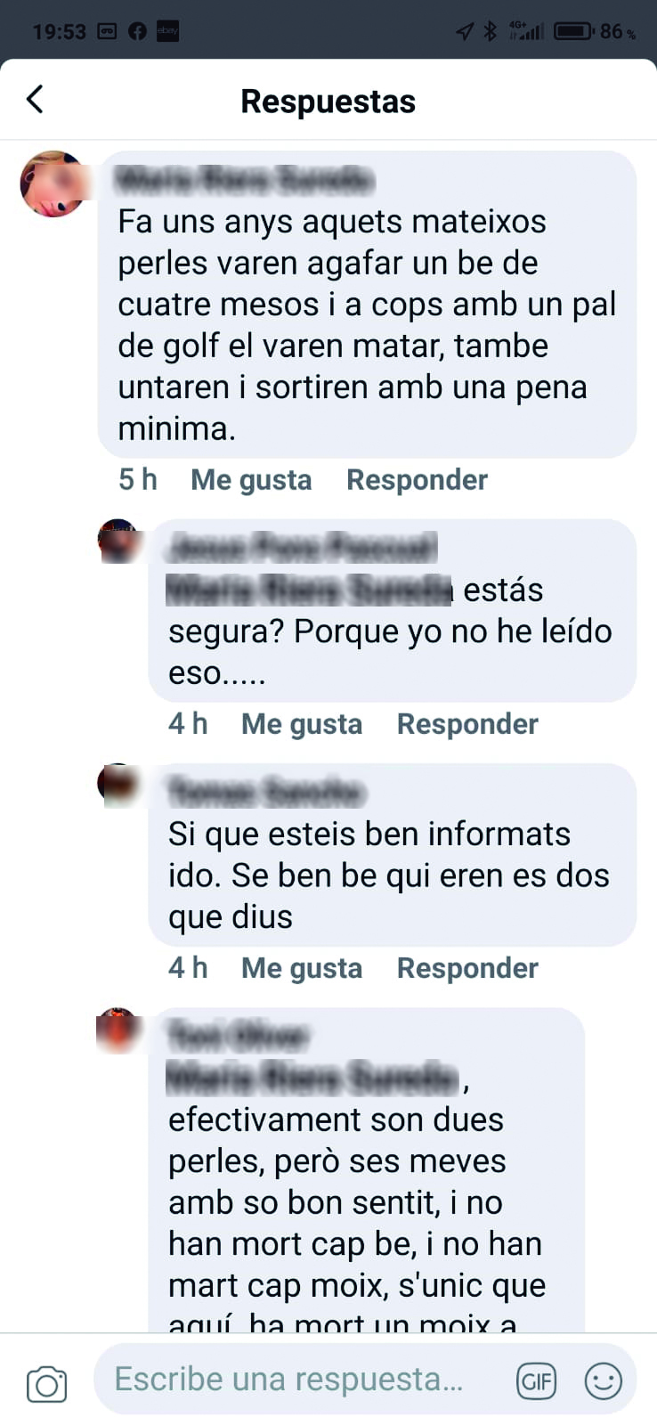 – També per les xarxes socials diuen que voltros, al 2014, ja vos varen detenir per haver maltractat a un mè a Manacor, llevar-li la mandíbula i matar-lo amb un pal de golf…